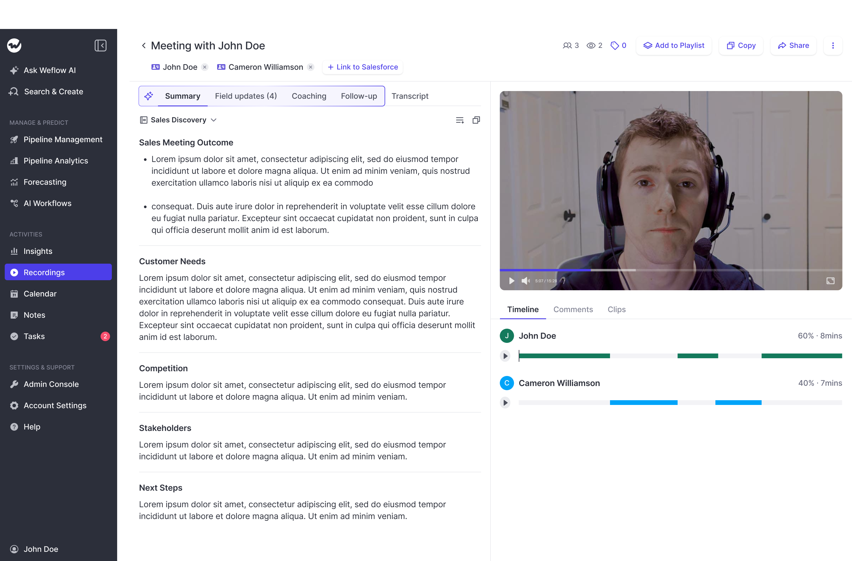 Coaching is less mature than Gong. Weflow covers scorecards, clips, playlists, comments, and post-call coaching, but it does not match Gong’s depth.