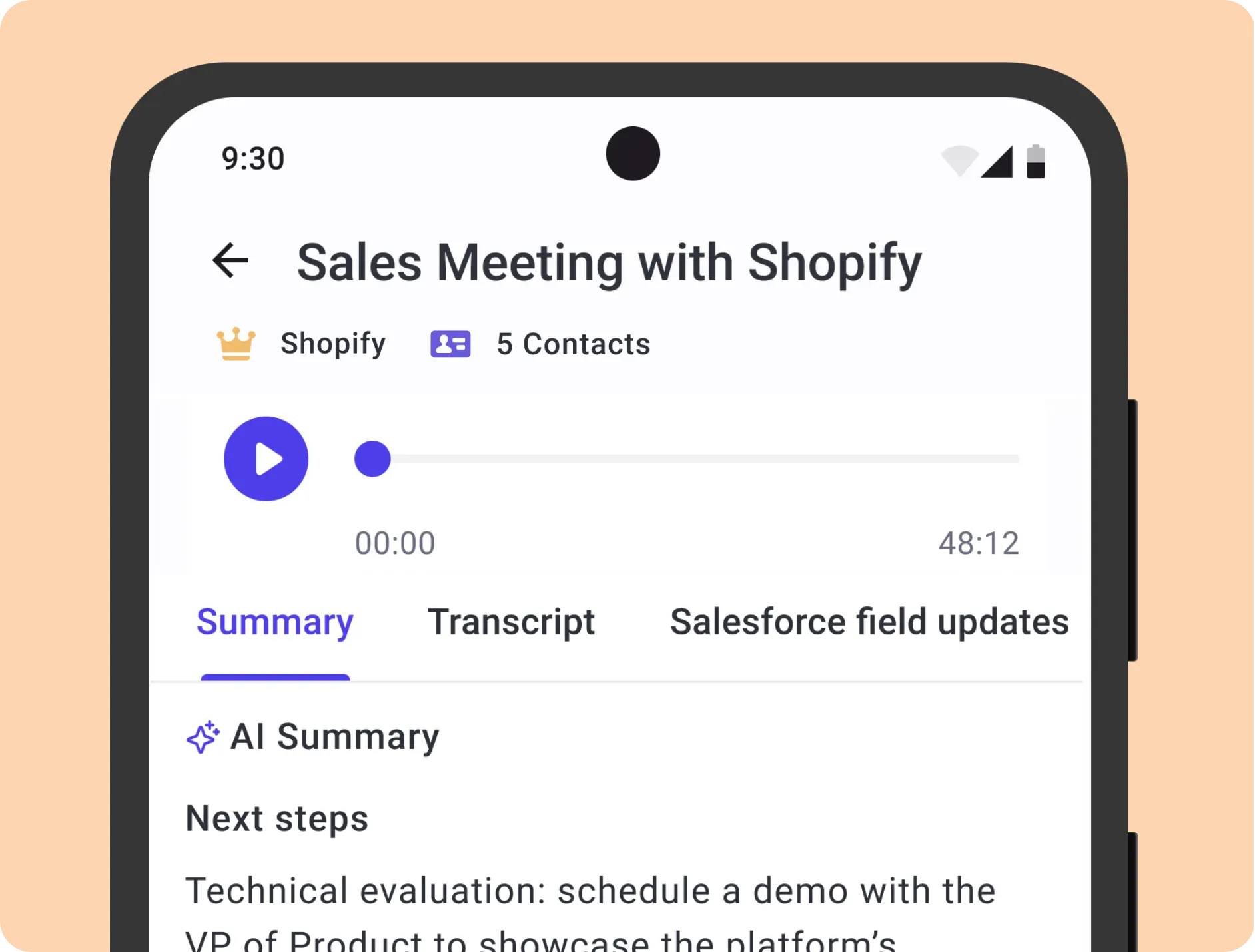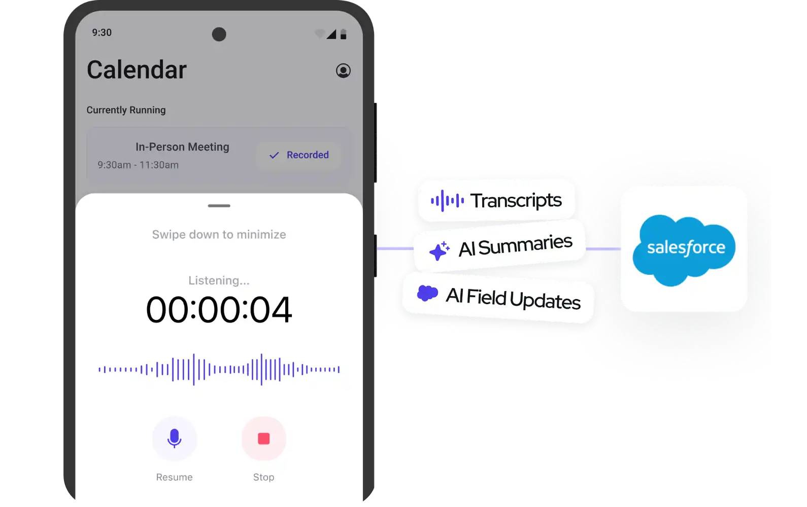Auto-sync AI summaries, transcripts, and field updates to Salesforce.