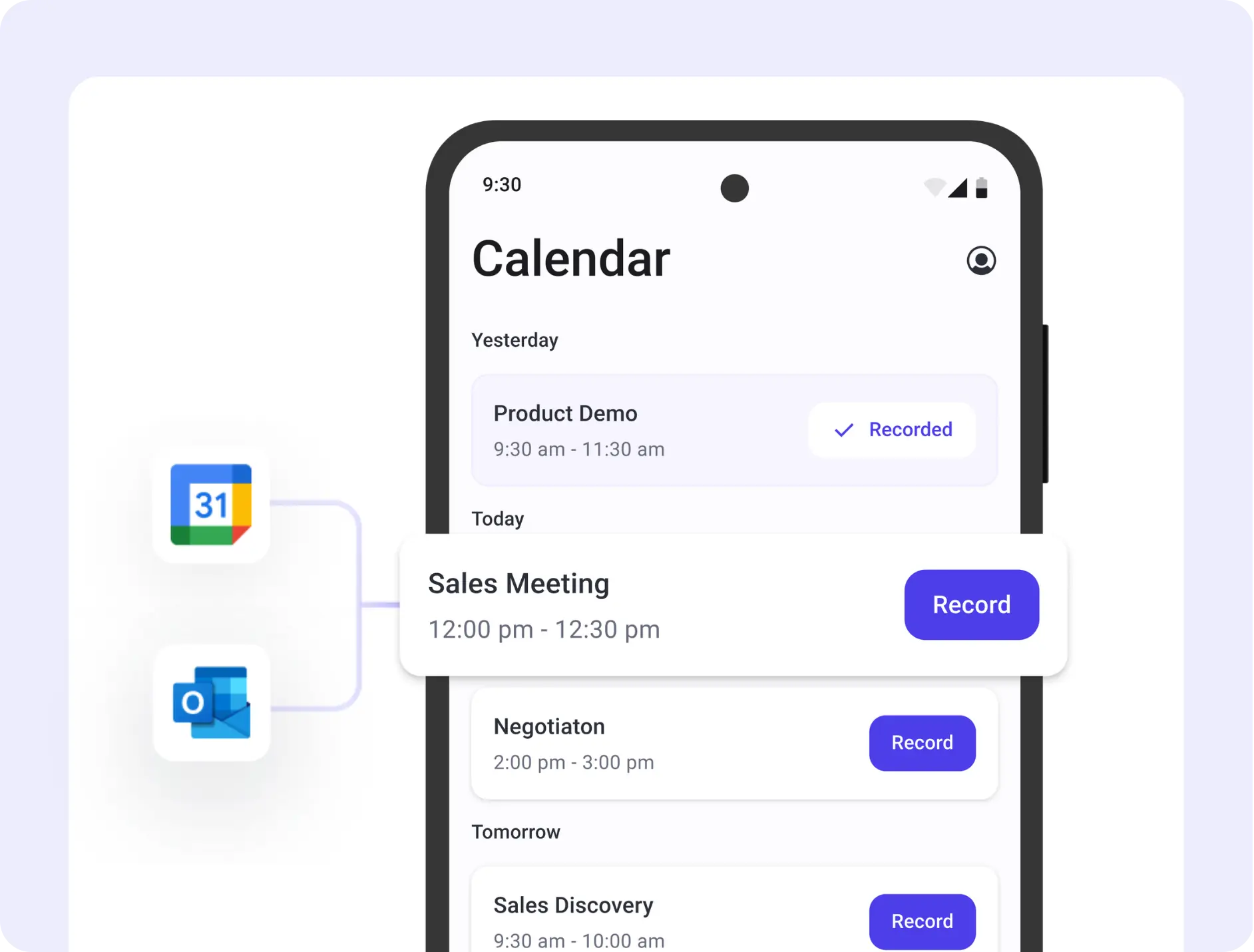 - Connect to Outlook/Google Calendar for 1-click recordings